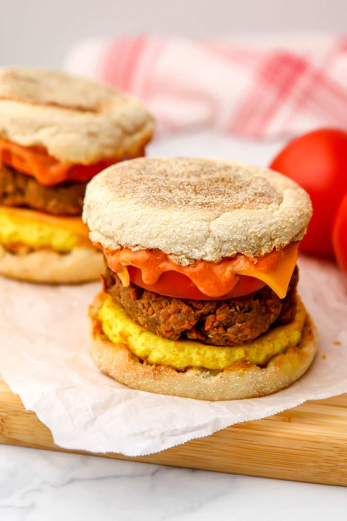 Refrigerate: These vegan breakfast sandwiches will keep well in the fridge for 3 – 5 days in an airtight container.